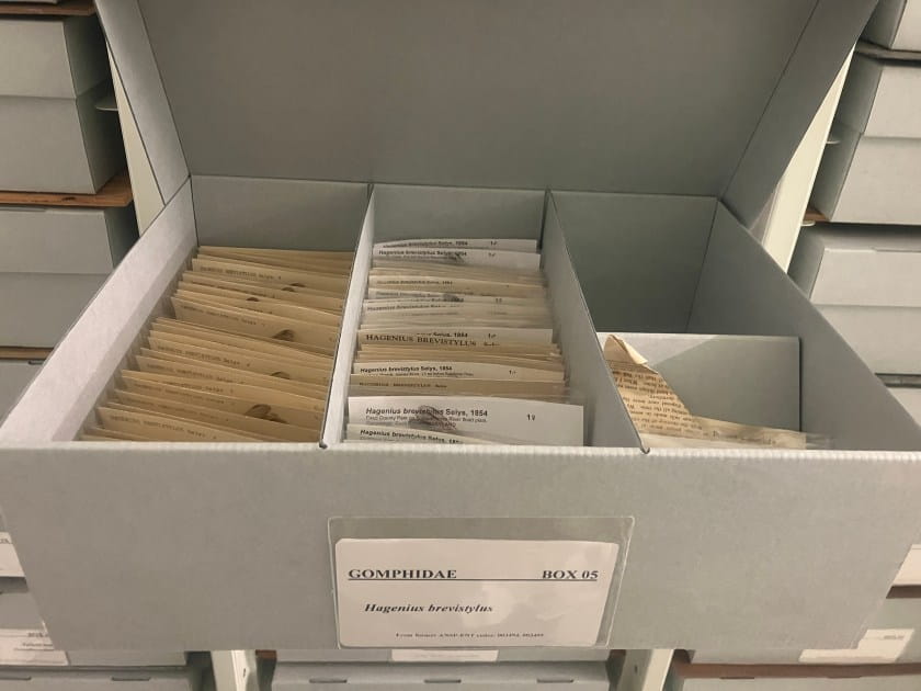 Organizing or “rehousing” literally means to move all of the specimens from one method of organization or containment to another. In the case of the Odonata (dragonflies and damselflies), the specimens themselves are stored in labelled glassine envelopes, which were then stored in standard curational Odonata boxes.