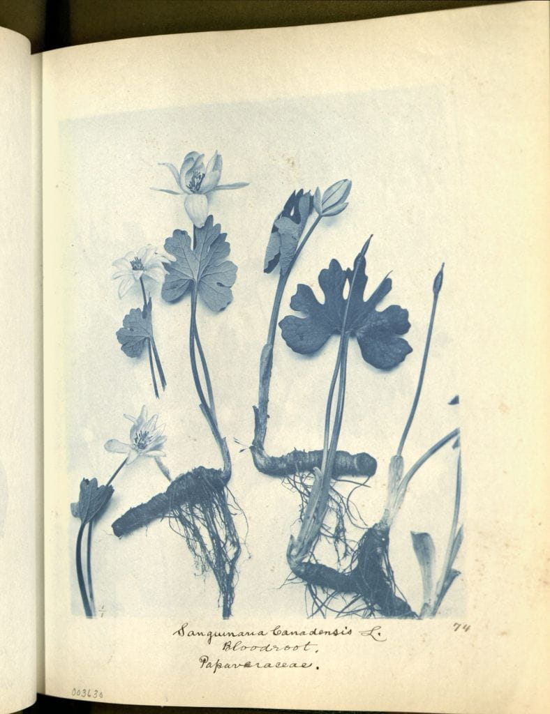 A cyanotype print of Sanguinaria canadensis from his title is one example. Also known as bloodroot, bloodwort and red puccoon, it is a native plant to eastern North America. Commonly found in woodlands around the Philadelphia area, it flowers briefly in the early spring with a delicate white or pink blossom around a golden center, growing close to the ground.