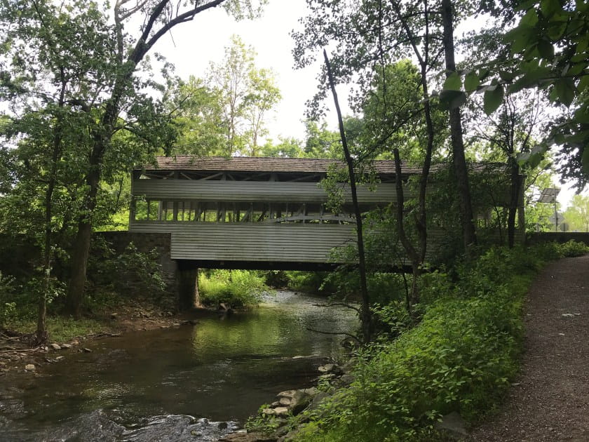 A bridge over the Wissahickon Creek along the Green Ribbon Trail in the Four Mills Nature Preserve in Ambler, PA.