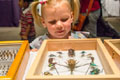 An Academy Entomologist shows pinned insect specimens to a visitor.
